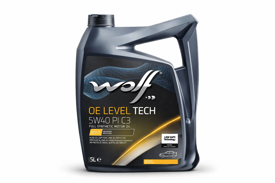 Aceite totalmente sintético Wolf OE Level Tech 5W‑40 PI C3 (4 L). Cumple VW 505.01, API SN, ACEA C3. Mid SAPS: protege filtros diésel, evita oxidaciones, depósitos y espesamiento del aceite. Ideal para motores turbodiésel Common‑Rail y TDI.