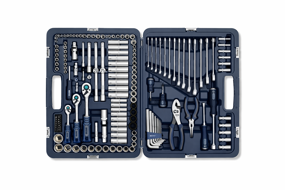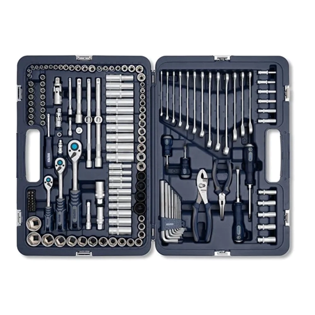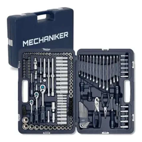 Este versátil kit contiene 160 piezas y ofrece encastres en medidas de 1/4", 3/8" y 1/2". Incluye bocallaves, extensiones, destornilladores, llaves combinadas, pinzas y más, con materiales de alta calidad como Cr‑V (cromo vanadio), Cr‑Mo (cromo molibdeno) y S2