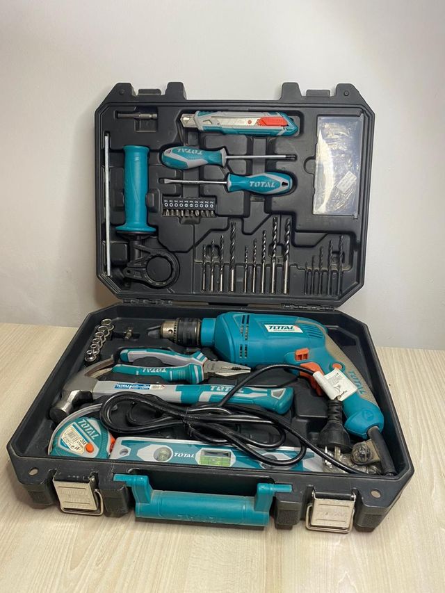 Taladro Total: Potente motor para perforar en una variedad de superficies como madera, metal, y plástico. Cuenta con un diseño ergonómico para un agarre cómodo y un uso prolongado sin fatiga.